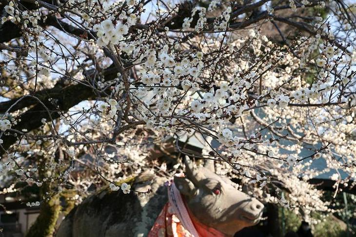 目が赤い訳は、道真公のお供であった牛が「瞬きもせず真っ直ぐに道真公を待つあまり目が真っ赤になった」