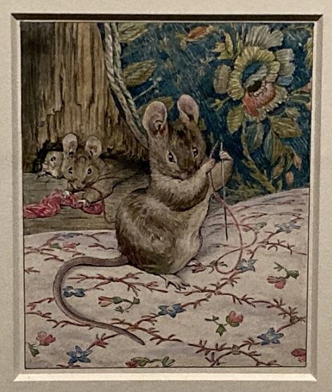 「グロスターの仕立て屋」で大活躍する、かわいらしいネズミたち。その背後や足元に、すてきな刺繍が見えますよね?