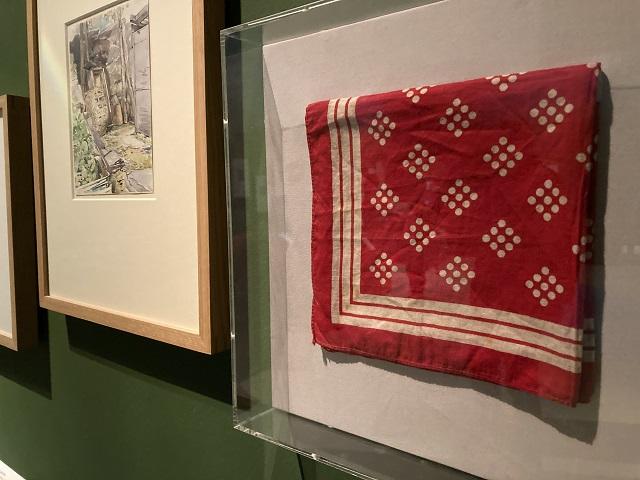 ねっ、絵の中のハンカチも同じデザインでしょう?柔らかいパステル色調で描かれていて本物のビビッドな赤とは違うものの、彼女が登場人物の衣類・小物・背景にいたるまで、つぶさに観察しながら描いた証拠と言えます。