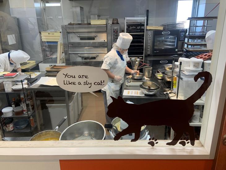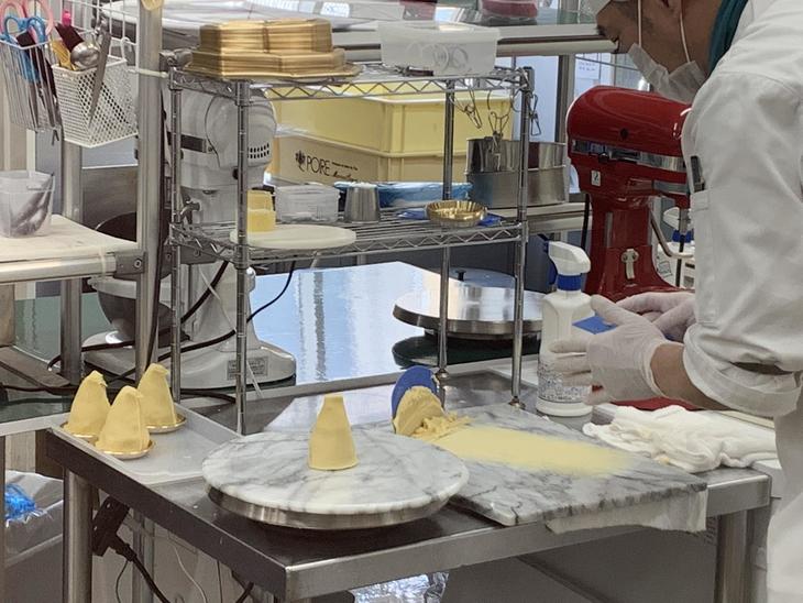 1階の工場見学通路です。ガラス越しにパティシエたちがケーキを作っているのが見えます。ケーキを買うだけでなく、工程が見られるのは大人も子供もうれしいですね。子供たちの夢も広がりそうです。