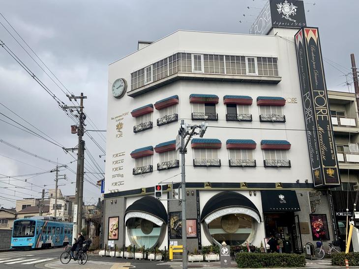 丸窓が特徴のポアールの創業地です。左にはチンチン電車の愛称で親しまれている阪堺電車が走っています。