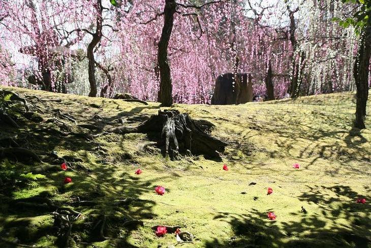 神苑奥に見えた、散り椿と枝垂れ梅。