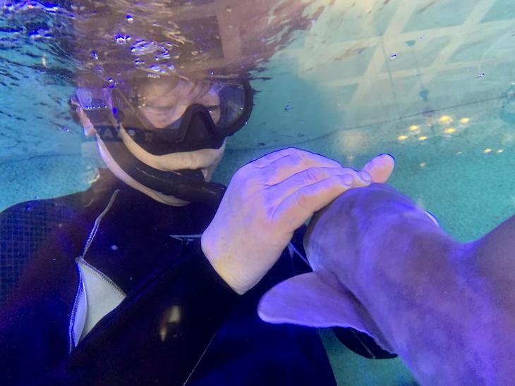 ダイバーさんが調教しています。ダンスとバイバイもします。懐いている姿がとっても可愛いです。ホテルフロントの水槽でサメと熱帯魚が共生しているのは、ここだけではないでしょうか。