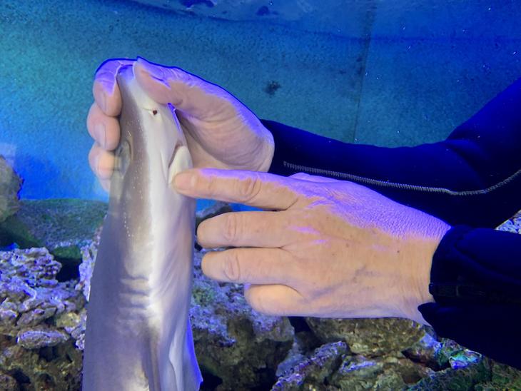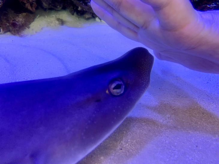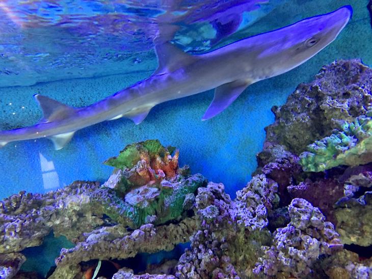 同じ水槽の中に、2匹のサメ(エイラクブカ)が共生しています。熱帯魚とは棲息環境が違うのに、同じ水槽で飼育されているのは驚きですね。
