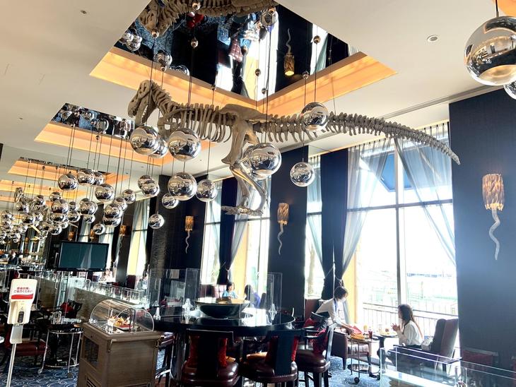 1階 ザ・レックスエンターテイメント内 「ラウンジR」の天井には巨大恐竜の化石が!どことなく可愛くてお洒落。こちらでシェフこだわりの料理や季節のカクテル、スイーツが楽しめます。