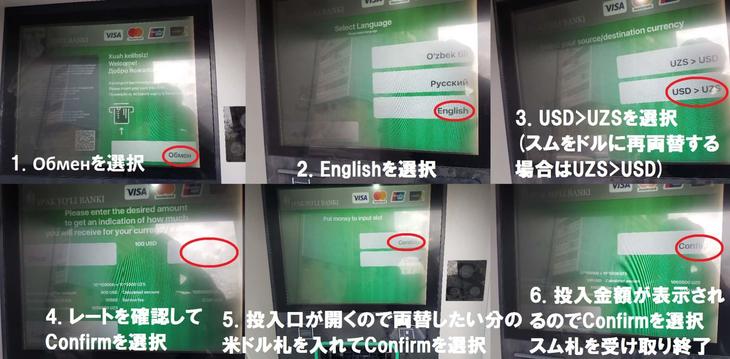 Ipak Yuli BankのATMでの両替操作方法を画像で解説したので、こちらもご参照ください。