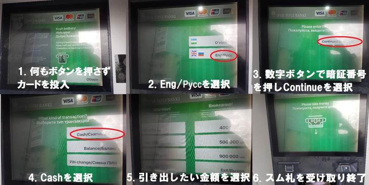 (※追記:2022年4月現在、Ipak Yuli BankのATMの引き出し上限金額は1000万スムになっています。60万スム以上を引き出す方は、下記画像5.のタイミングで出てくるOther Amountボタンを選択、次の画面でSavingを選択後希望金額を入力してください。)
