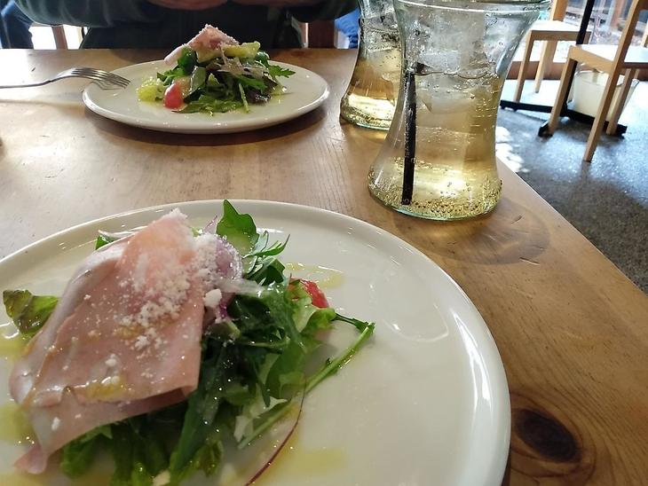 ほどなく、ジンジャエールとサラダが運ばれてきます。生ハムとグリーンのサラダです。