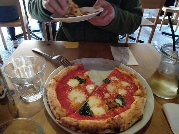 シンプルなマルゲリータです。生地は薄目でもっちり、トマトソースが濃厚でおいし~。