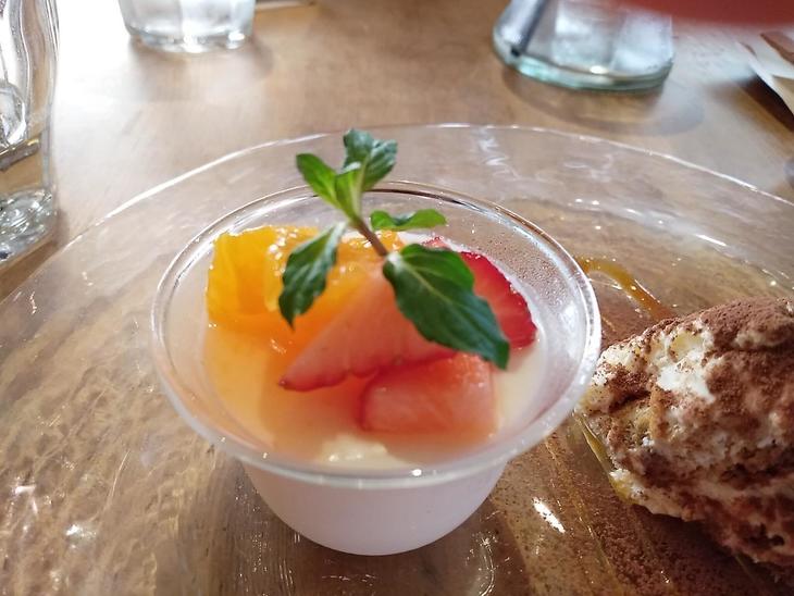 そして、ドルチェもティラミスとパンナコッタのふたつを頼んでみました。パンナコッタはふわっふわです。このパンナコッタは今まで食べたなかでも絶品です。フルーツも甘くてクオリティの高いおいしさです。