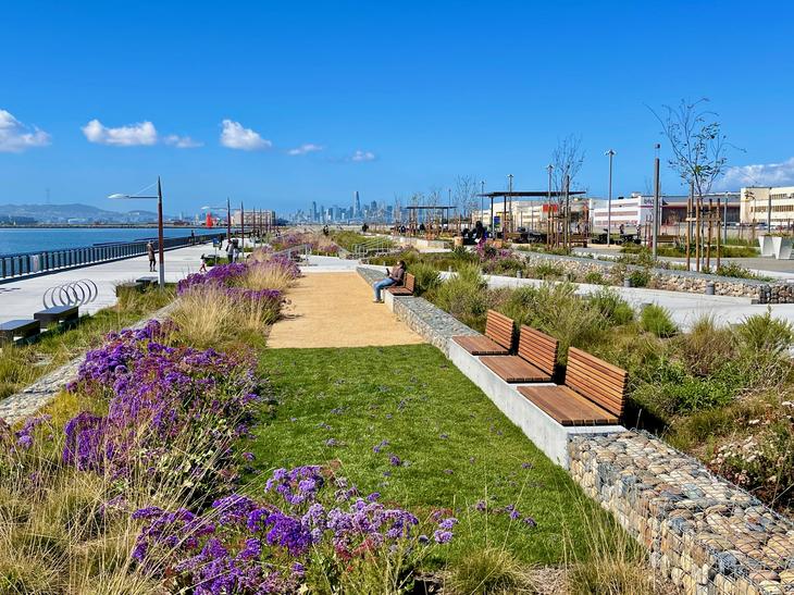 造成中の公園「アラメダズ・ウォーターフロント公園(Alameda's Waterfront Park)」です。春の暖かな午後、海風にそよぐお花はとても優しく穏やかに咲いて。出来立てのベンチに座って光る水面や遠くの景色を眺めながらゆっくり物思い……時間がゆっくり過ぎていくようです。湾に浮かぶさまざまな景色をひとりきりで眺められた贅沢な空間です。静かに打ち寄せる波は、日常がどこかに飛んでいってしまいそうなほど"オフ"になれます。