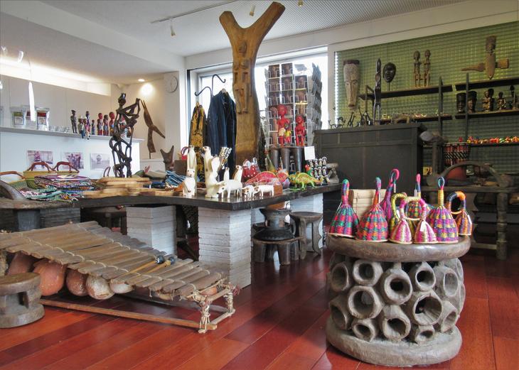 入口のミュージアムショップには、アフリカのマスクや立像のほか、雑貨や楽器、布製品など、じっくりと見て触って選ぶ楽しみを味わえますよ。