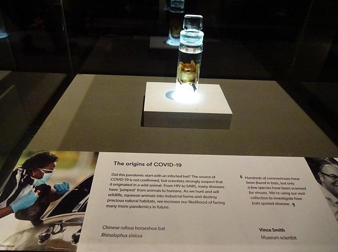 入ってすぐのところに、新型コロナウイルスの原因ではないかと推測されているコウモリ。解説を読むと、