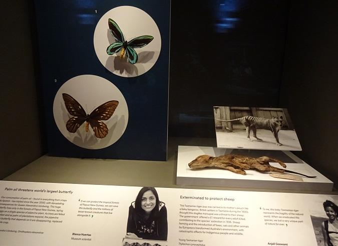 ほかにも植物油として最も広く使われているパームオイルの原料アブラヤシ畑のために熱帯雨林が失われ、絶滅寸前の蝶。オーストラリアの開拓時、羊を襲うとして駆除した結果、絶滅してしまったタスマニア・タイガー。とさまざまな実例が展示されています。