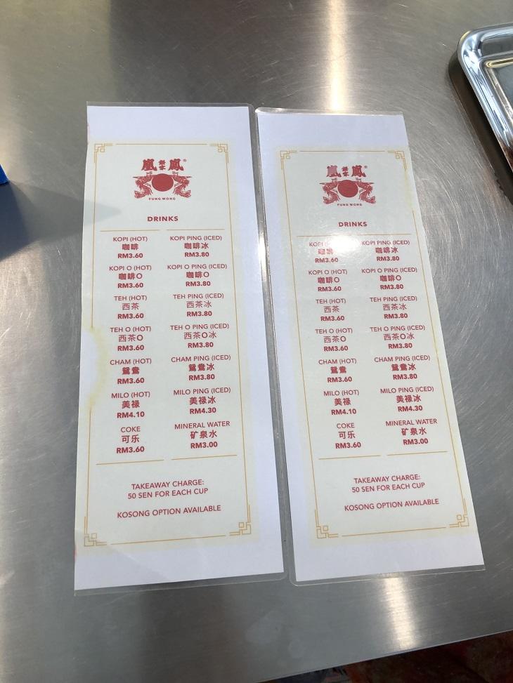 コーヒー(KOPI)、紅茶(TEH)、コーヒーと紅茶を混ぜたもの(CHAM)、Oは砂糖入り、PINGはアイスを表しています。