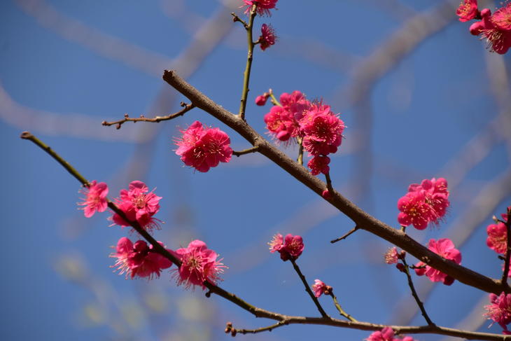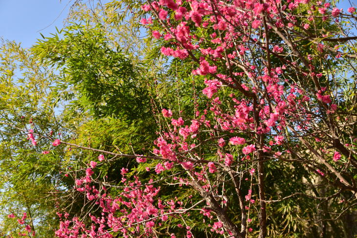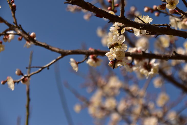 マスク越しでも梅の甘い香りが漂い、やっと春が来たんだなととても嬉しい気持ちになりました。写真に小さく映っている蜂も嬉しそうに見えます。さらに進むと紅色の梅の木があり、人気で多くの人が写真を撮っていました。