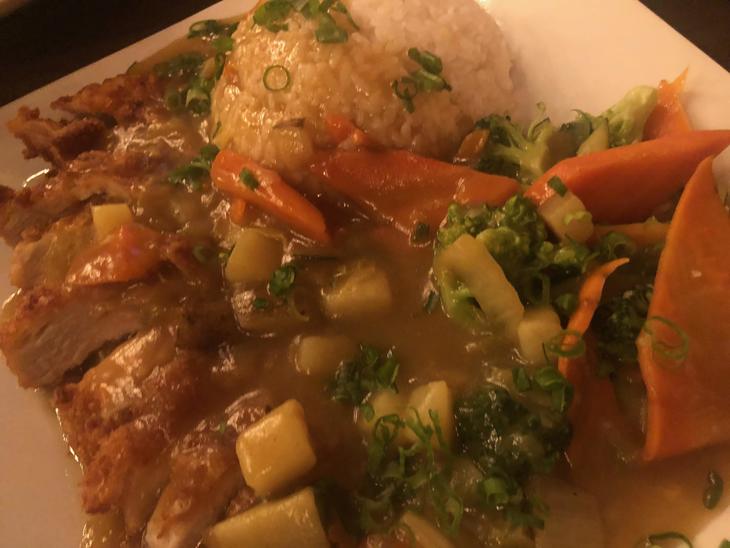 極めつけはカツカレー。写真だといわゆる王道のカツカレーなんですが、実際には黄土色の水っぽいカレーに半生の人参とブロッコリーが絡めてあって、明らかに煮込んでないです。他の料理に添える野菜を使い回して添えているだけで、これ最悪でした。