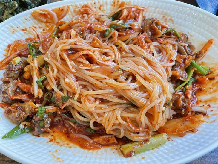 もうひとつはチョルコルベンイ(쫄골뱅이)というおつまみです。チョルはチョルミョンという小麦粉やでんぷんが原料のもちもちした麺です。コルベンイはつぶ貝で素麺と混ぜるのが一般的ですが、こちらのお店はチョルミョンでしこしこしていて私は素麺よりも好みでした。