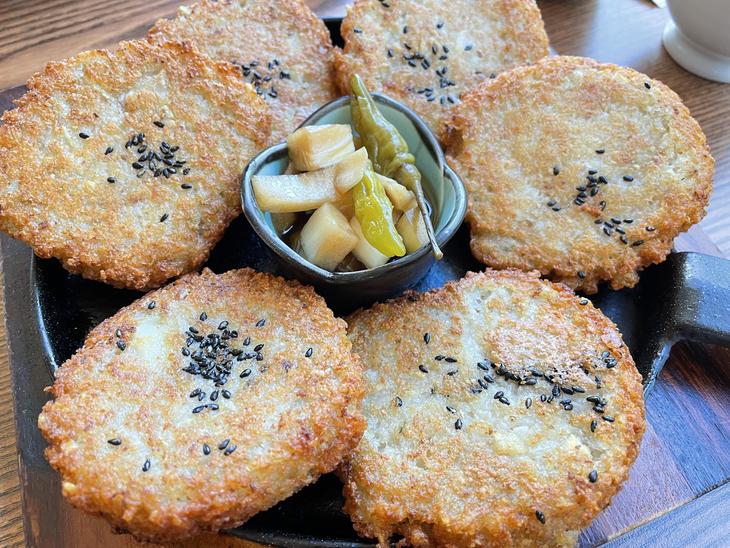 カムジャジョン(감자전)というジャガイモ(カムジャ)を使ったチヂミです。サクサク香ばしく、お酒にとっても合います。