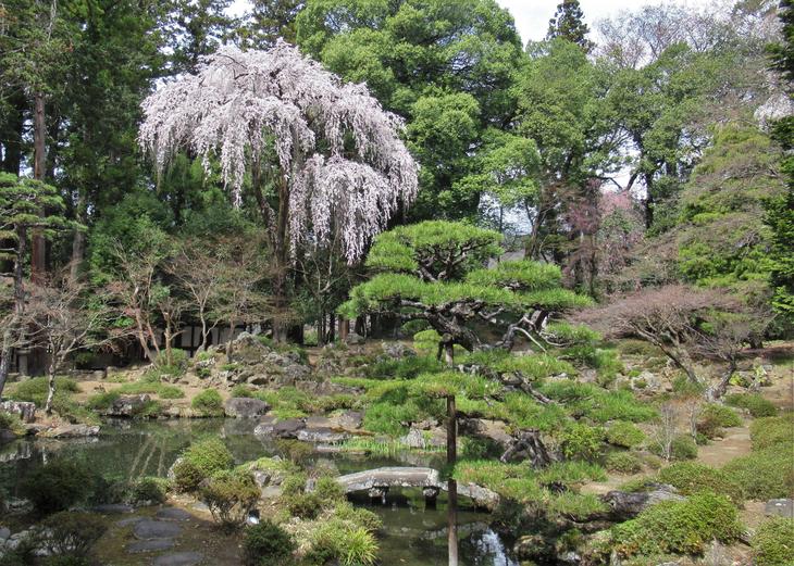 国の名勝指定を受けている庭園です。鎌倉時代、京都嵯峨野の天龍寺、嵐山の西芳寺(苔寺)の庭園も手がけたという夢窓国師の代表的な築庭庭園として有名だとか。しだれ桜も美しかったです。