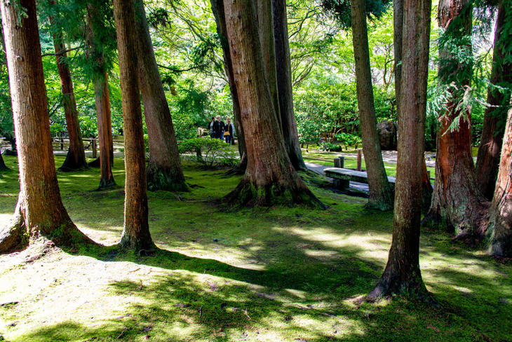 修理中の五重塔の裏には、京都の大原を思い起こす苔むした杉林があり、その先には枯山水が作られています。