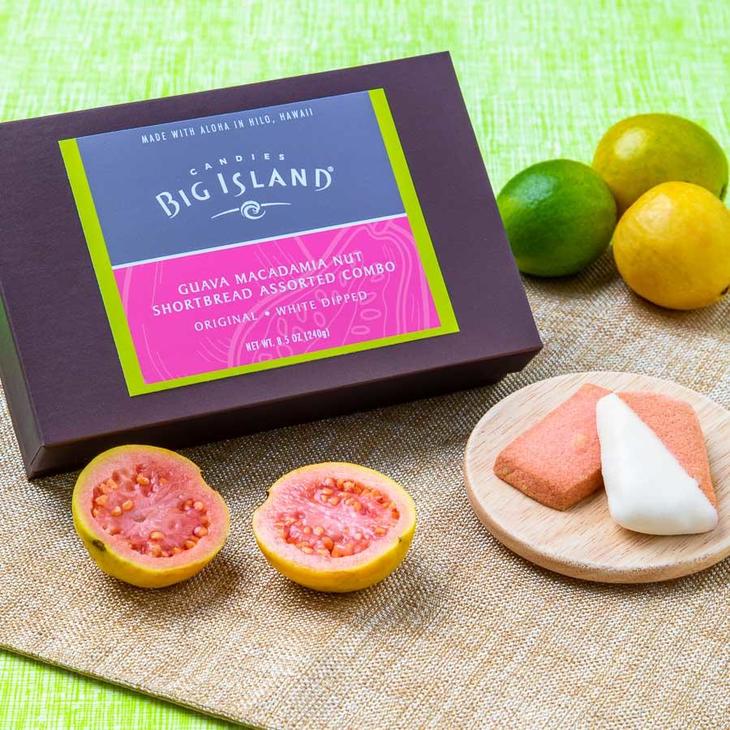 グアバ・マカダミアナッツ・ショートブレッドは、2年ぶりにハワイ島ヒロで開催されるメリーモナーク・フェスティバルを祝して2022年4月17日から発売となります。鮮やかなピンク色のステッカーの化粧箱には、ショートブレッドが9個とチョコがけが10個入っています。ハワイ島ヒロの旗艦店やアラモアナ店で、またはオンラインおよびメールオーダーで注文することができます。