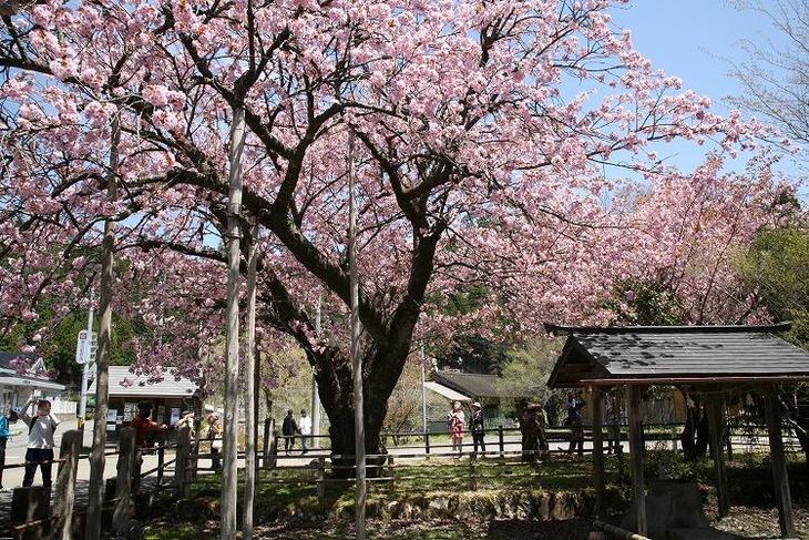百年桜の幹の太さは約3.1m。高さは約8mの大きな桜の木で、山桜の突然変異種で10~12枚の八重桜の中に