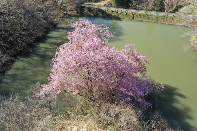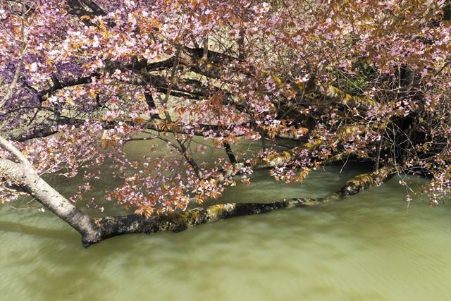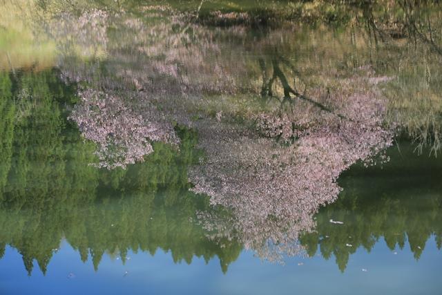 池の土手に根を張るオオヤマザクラで、やや濃いめの色味を薄っすらと水面に映し込みます。