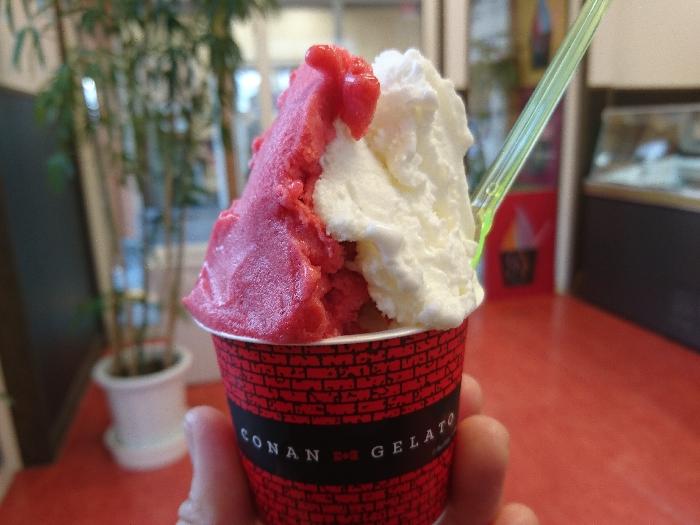 商店街内にある「CONAN GELATO」では、地元産のフルーツ、野菜、牛乳などを使用したジェラートメニューが豊富でおいしいんですが、APTX4869をイメージして作ったオリジナルジェラートがオススメ。
