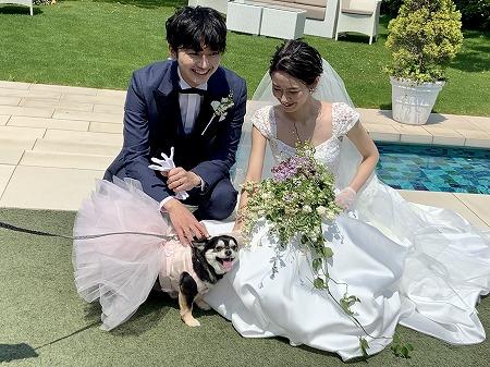 お洒落なドレスを着たワンちゃん。式では立派な仕事をしていました。