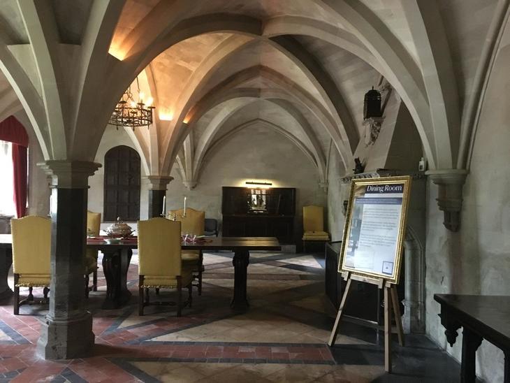 当時の図書室は夜になると、客人とともに食前酒をたしなむ場となり、男爵は大好物のソルティードッグのグラスを傾けました。そのあとは地下階にあるダイニングルームでの晩餐となりますが、こちらはとりわけ修道院の面影を強く残した部屋で、アーチ型の天井と床のタイルが硬質な感じで、厳かな気分になります。