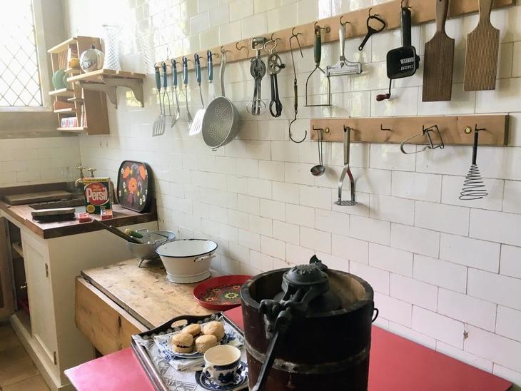 そのまま厨房へとつながる炊事場エリアは、男爵が過ごした生活がどのようなものだったか、後世へ伝えたいというご本人たっての希望で、執事の食品庫や台所、食器洗い場、磨き部屋、使用人の休憩室を当時の様子そのまま、忠実に再現されました。