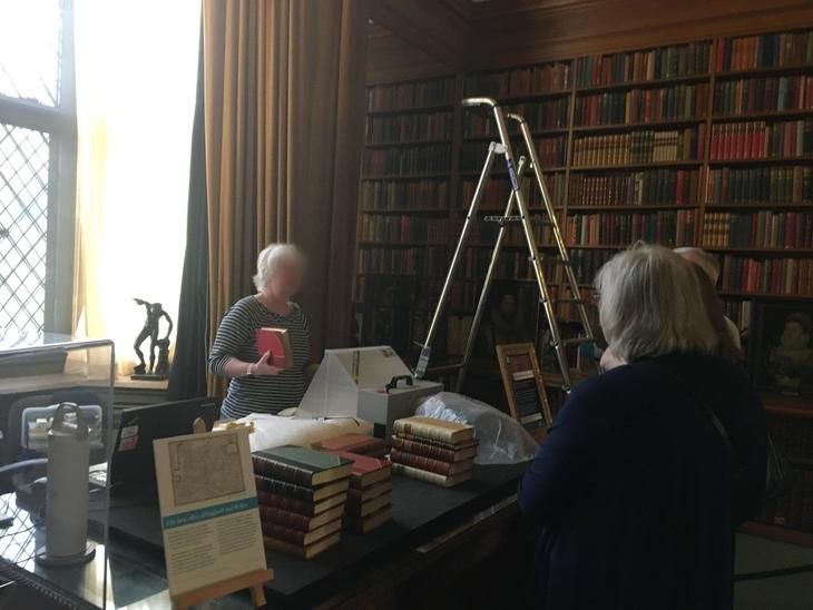 年代ものの書籍ばかりゆえ、修復作業は順繰りに常時行われており、表紙カバーのはがれている部分を継ぎ足したり、とじ糸が緩んでいるものを直したりとやることは限りなくありそうです。説明するスタッフの横には見慣れない布団乾燥機のような?!機械があったり、ずいぶんと高さのある脚立が置かれていたりと、作業の様子が伝わってきました。