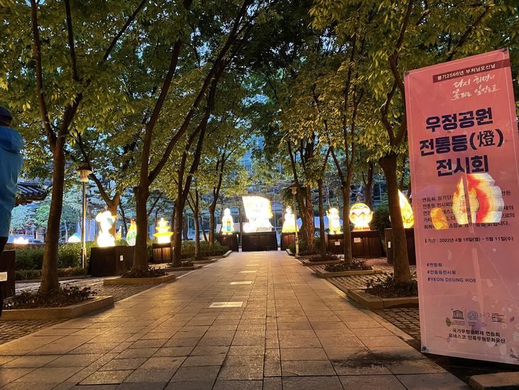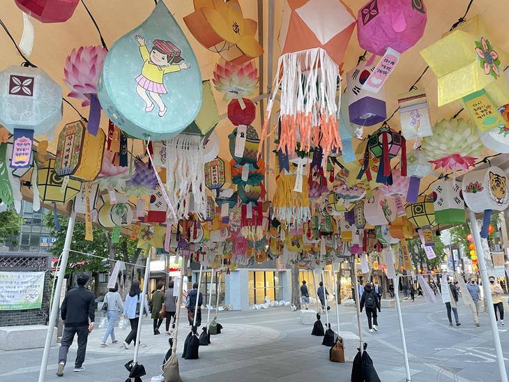 さて、今年の5月8日(旧暦4月8日)はお釈迦様の誕生日で祝日です。そのため、仏教徒の多い韓国では町のあちこちでカラフルな提灯が飾られています。4月29日から5月1日までお釈迦様の誕生日を祝うために無形文化遺産の燃燈会が開かれています。コロナによって昨年、一昨年は開催されなかったため、3年ぶりの開催です。今回はその様子の一部、伝統燈の展示を紹介します。