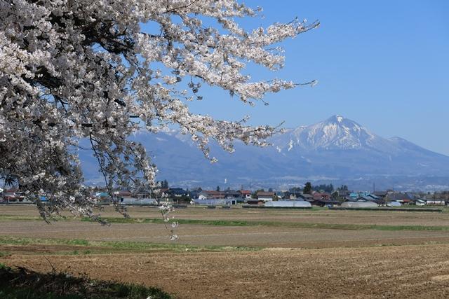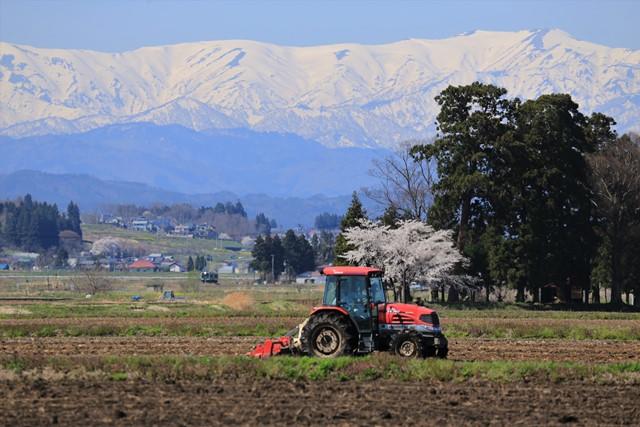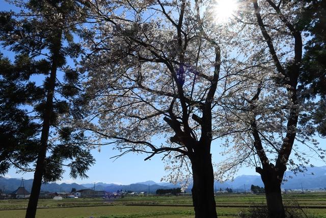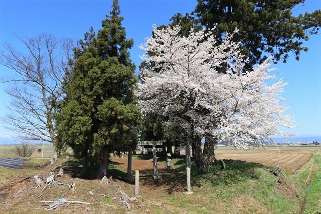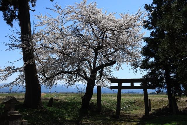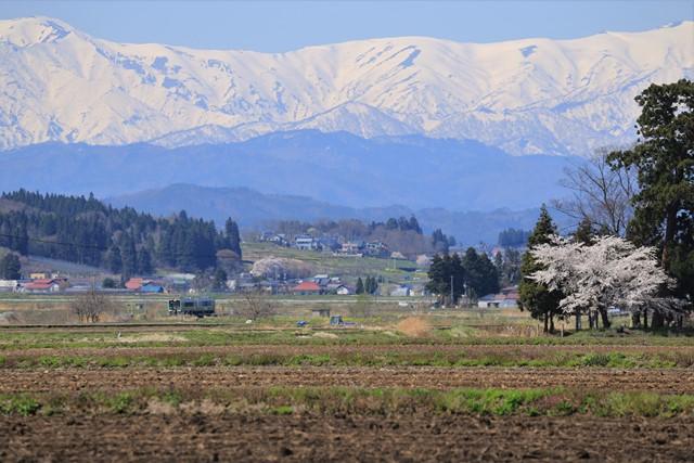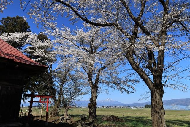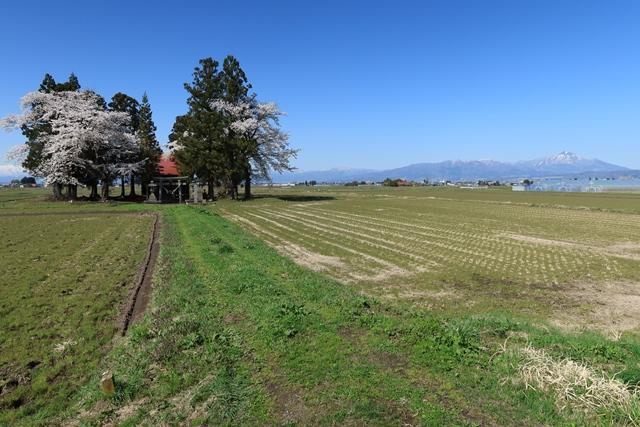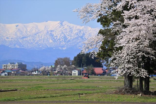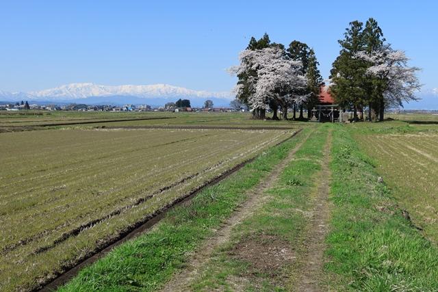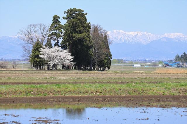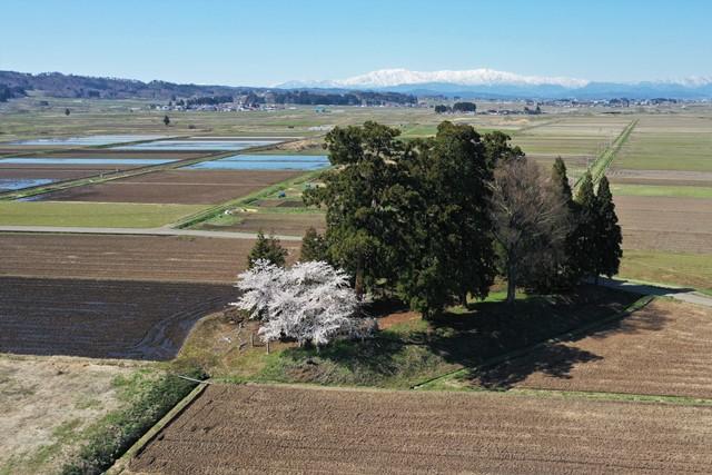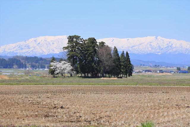 田園地帯に浮島の如く点在する神社と桜、そして残雪の飯豊連峰を望みます。
