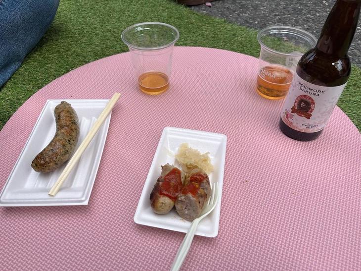 買ってきたソーセージとさくらビールを道路脇に座っていただきます。