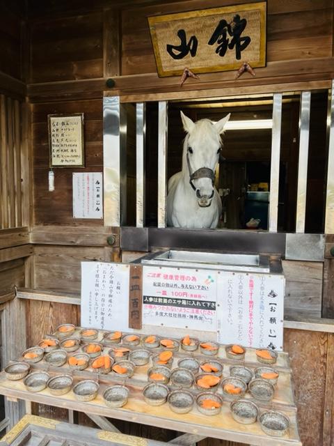 最初に出迎えてくれるのは白い神馬「錦山(きんざん)」です。