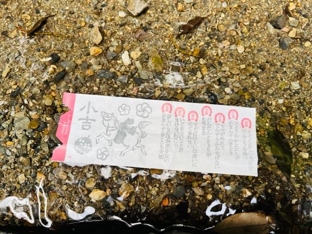 参道から脇を流れる清流、落葉川におりて、水籤を浸します。