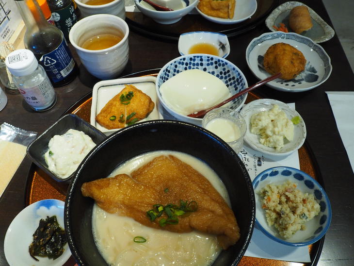甘辛く煮含めた油揚げも豆乳のスープも優しい味です。