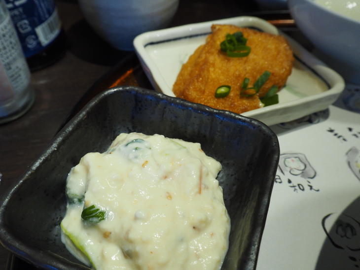 奥は厚揚げです。お店自慢のとろみのついたお醤油をかけていただきます。