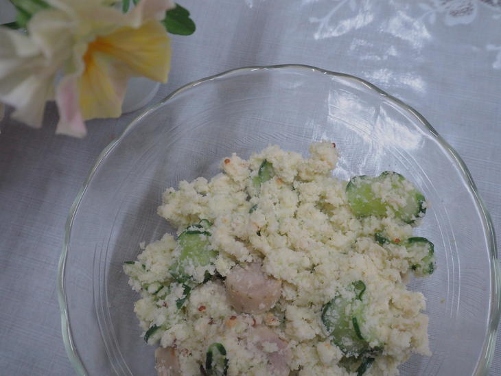 家に帰ってさっそく青大豆のおからでサラダを作りました。青大豆は白大豆の3倍の甘みがあるとか!