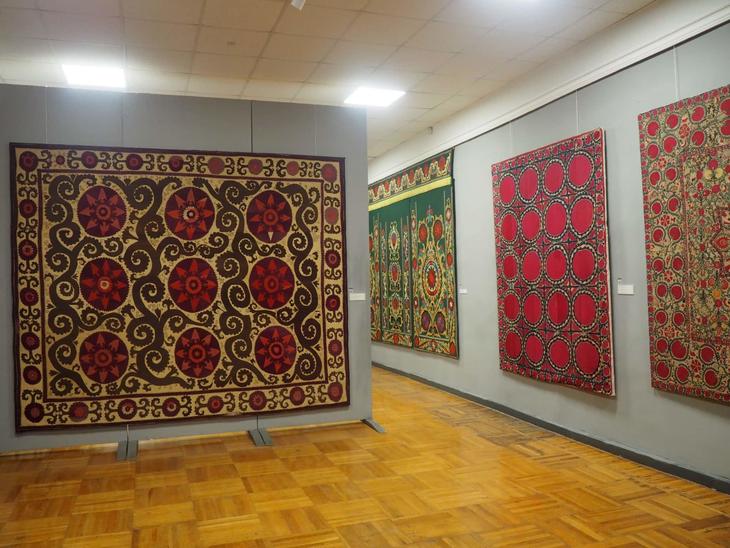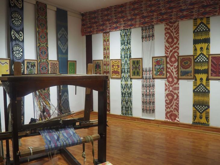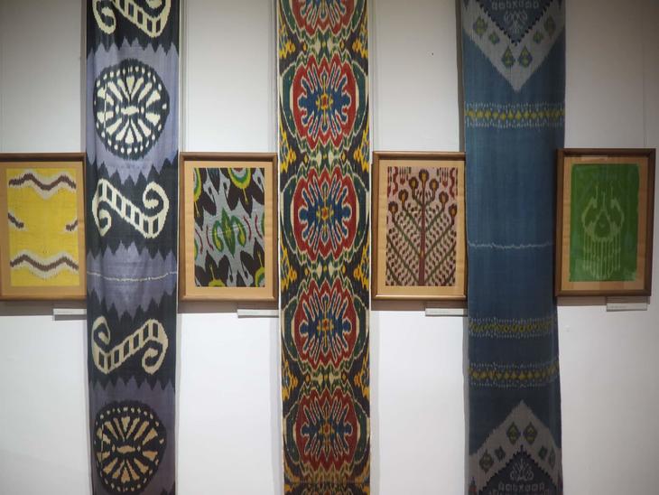 窓口でチケット(2022年4月現在で2万5000スム)を買うと、まず窓口裏の入口から入るよう案内されます。入ってみると目に飛び込んでくるのは色鮮やかな空間。日本でも密かにファンが増えてきた、独特な絣(かすり)模様を持つ生地アトラス・アドラスや生地いっぱいの刺繍スザニの展示からスタートです。