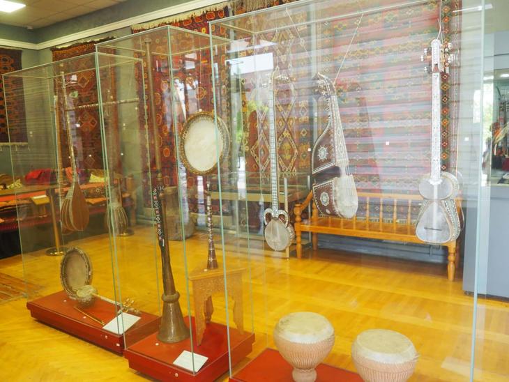さらに次の部屋がじゅうたん・民族楽器コーナー。ウズベキスタンや中央アジアの民族楽器、旅情をそそる音色でいいですよね。この国を代表する弦楽器ドゥタールについて前特派員の齋藤さんが記事を書かれていましたが、実は私も現在レッスンに通っています。齋藤さん同様、ウストズ(師匠)のスパルタ式レッスンを受けているところです……。