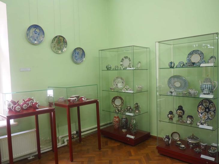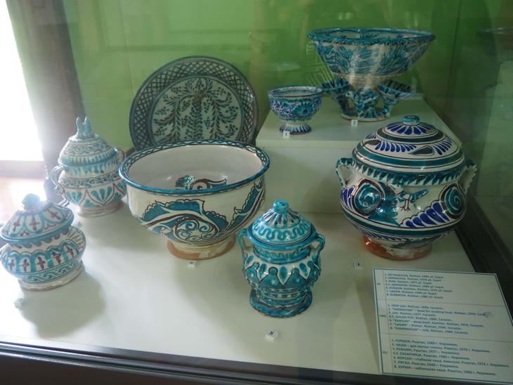 スザニ同様世界的にファンが多い、陶器コーナーも。リシタンやギジュドゥヴァンといった有名生産地の伝統陶器から、帝政ロシア時代やソビエト時代のアンティーク食器まで幅広いラインアップが展示されています。ほかの伝統工芸品同様、やはり時代や地域によって模様や色合いが微妙に異なっているのに気づくはず。