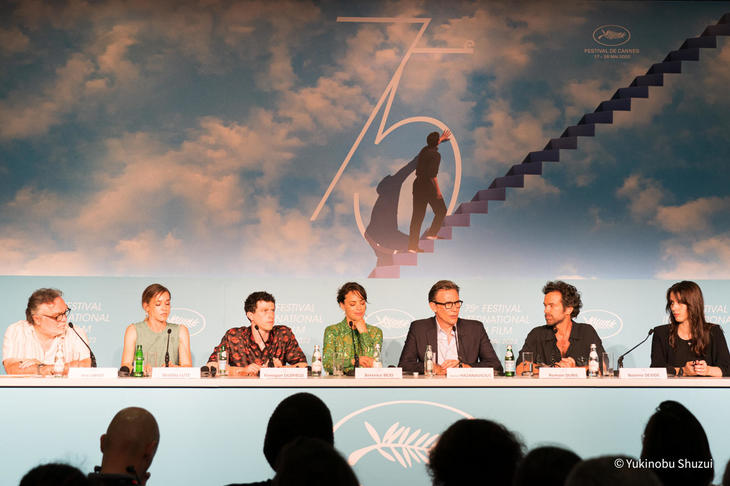 ▲記者会見場でのアザナビシウス監督(左から4人目)や主演のロマン・デュリスさん(右から2人目)ら