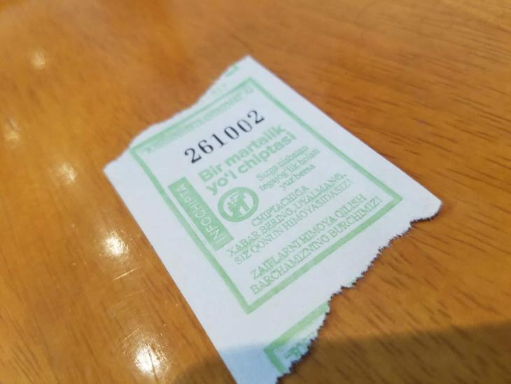 支払い方法について。車内を巡回している車掌さんがいれば車掌さんに、車掌さんがいない小型バスなどでは運転手に直接一律運賃の2000スム(2023年現在のレートで約24円)を支払うことになり、小さいチケットをもらいます(2023年夏に1400スムから値上げ)。このチケットがまたレトロで風情があるのです。