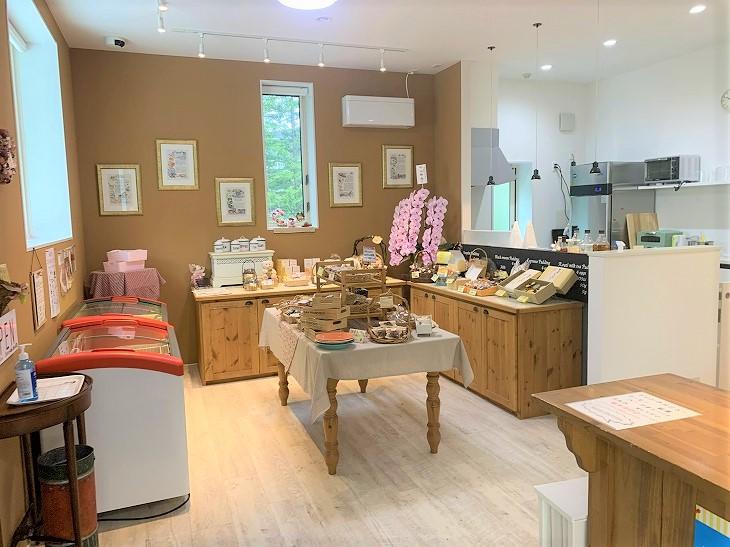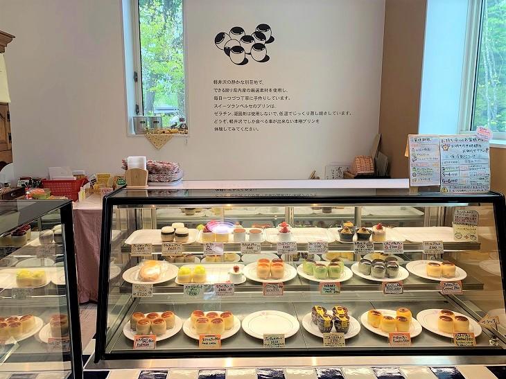 プリン専門店。プリン好きにはたまりませんね。壁には「軽井沢の静かな別荘地でできる限り県内産の厳選素材を使用し、毎日一つづつ丁寧に手作りしています。スイーツランベルセのプリンは、ゼラチン、凝固剤は使用しないで、低温でじっくり蒸し焼きしています。どうぞ、軽井沢でしか食べることができない本格プリンを体験してみてください」。期待が膨らみます。
