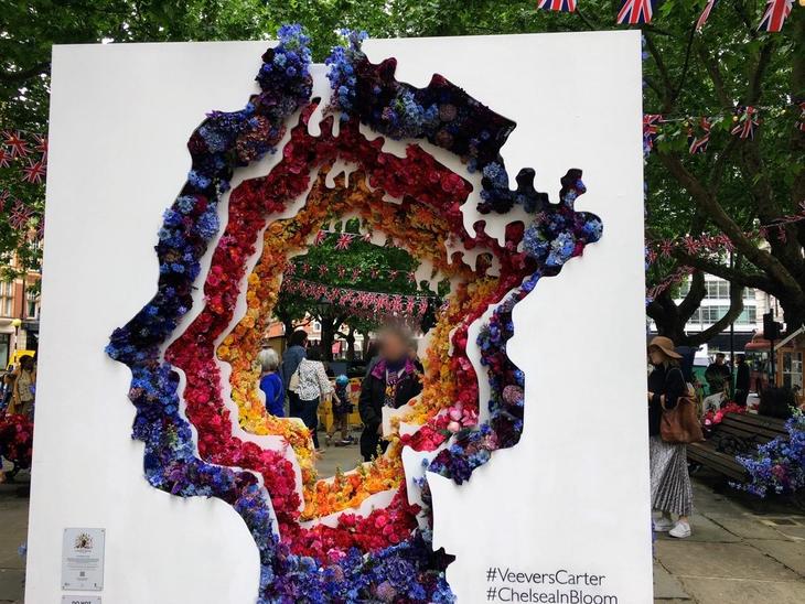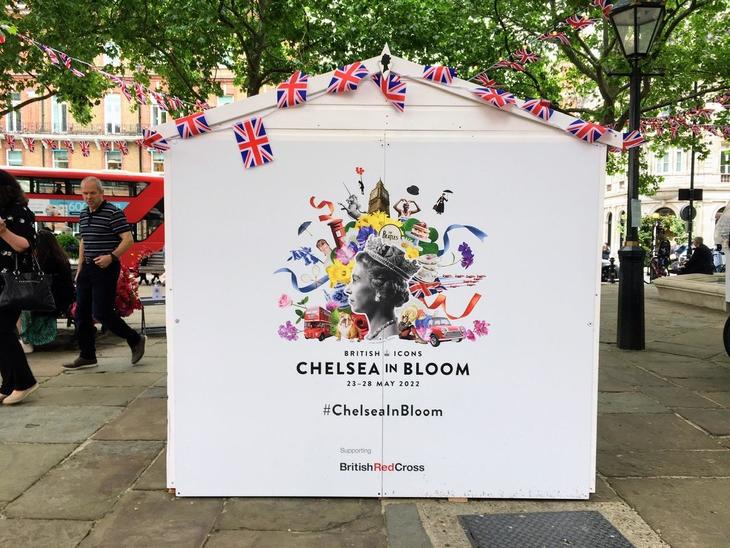 エリアによってはそのディスプレイを競う、「チェルシー・イン・ブルーム」に参加している店舗もあります。毎年テーマがあり、2022年の今年は”イギリスの象徴(British Icons)”なので、公式ロゴもエリザベス女王を中心に、ビートルズや2階建てバス、ビッグベン時計台など、おなじみのアイコンが散りばめられています。