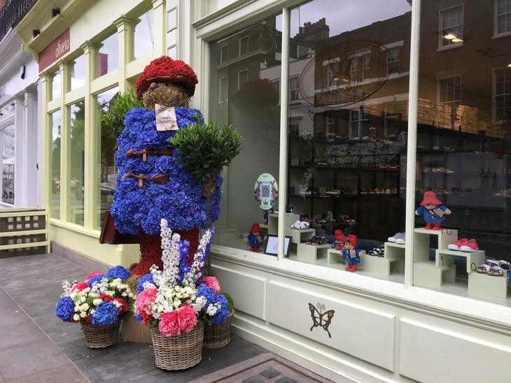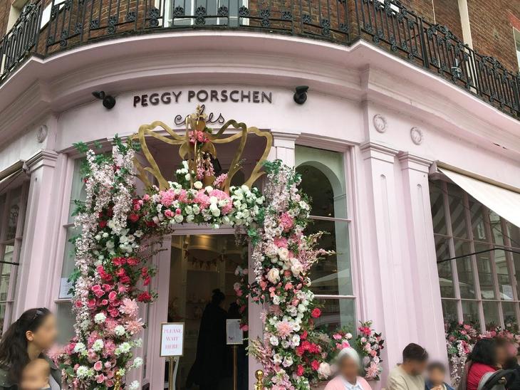 私が今回拠点にしたのは、電車のロンドン・ヴィクトリア駅。長距離バスのコーチ・ステーションを抜けた、エリザベス通りから徐々に、ショーにちなんだ飾りつけが見られました。ピンクの外壁で普段から撮影スポットとしても人気の高いケーキ店、「ペギー・ポーション」がまずはお出迎え。