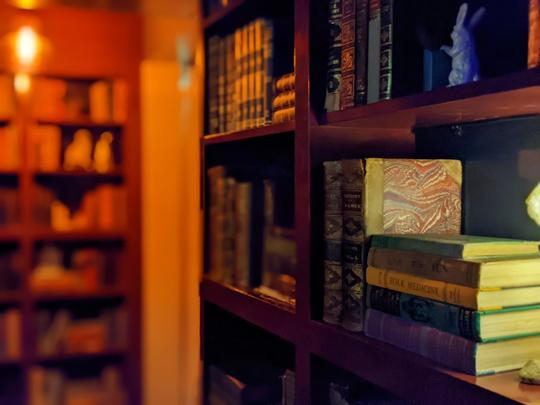 Wursthallの店内の奥にある地下に下る階段を探し、階段に描かれている白いウサギを追って階段を下っていきます。白ウサギはカーテンに続いて走っており、カーテンをめくると本棚の有る小部屋があります。